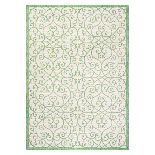 With its filigree design inspired by Spanish wrought iron, our Boho-chic rug adds eclectic style to an outdoor porch or patio. Varied tones of cream mingled with a green pattern give this rug a hand-woven, vintage vibe.