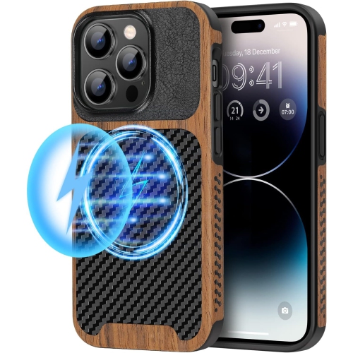 Magnetic Case Compatible with iPhone 14 Pro Max Case Wood Grain with Carbon Fiber Texture Design Leather Hybrid