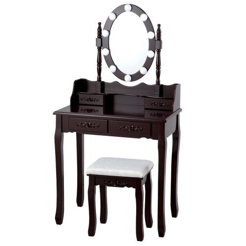 ·1 x Instructions Description:It's time to beautify yourself in the comfort of the elegant vanity table with a cushioned stool and LED Lights mirror. Perfect combination of solid wood and MDF materials of this dressing table is more stable and doesn't wobble easily when using. The amazing of this vanity table set is that it has an oval mirror with 10 LED bulbs offer enough soft white light without giving out heat. Most importantly you can adjust the brightness to suit different lighting conditions and meet your needs. 360° rotatable mirror can be moved out you can use it as an ordinary writing or laptop table. Spacious tabletop and 4 drawers offer enough space for you to organize your cosmetics jewelry or other items. Exquisite workmanship and elegant design can give your room a unique charm suitable for any decoration in your home. A cushioned stool makes you feel soft and comfortable when you sit on it. You can also use it as an ordinary stool. If you are looking for it don't hesitate to buy it!