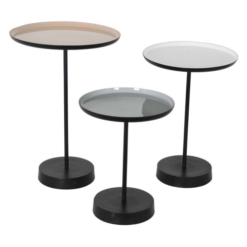 Add a playful pop to modern interiors with this set of three decorative accent tables. Featuring a neutral color palette of white, beige, and gray, each tabletop is coated in enamel to create a shiny surface and is supported by a cast-iron base. A decorative lip around the edge of each tabletop keeps magazines and glasses in place.Features : Finish: White, Beige, Enamel, and Gray Powder CoatedAccent Table is constructed in ironli...