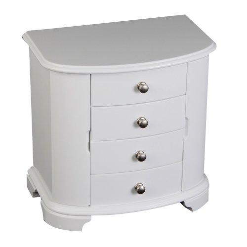 The serene simplicity of the Mele and Co Kaitlyn musical jewelry box will strike a chord with its clean white finish and sumptuous gray lining. Dual necklace doors, interior mirror, and three open drawers add storage and sensibility to this jewelry chest's tasteful tenor.