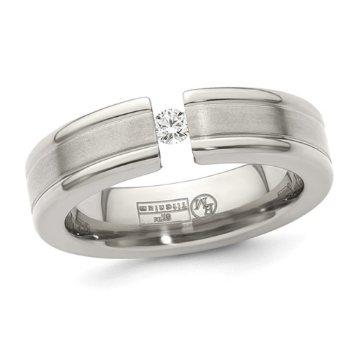 A sparkling 1/10 carat (ctw0 round diamond sits at the center of this mens wedding band ring which offers comfort and quality in one package. This ring is constructed from polished strong titanium with a brushed center and polished outer edge.