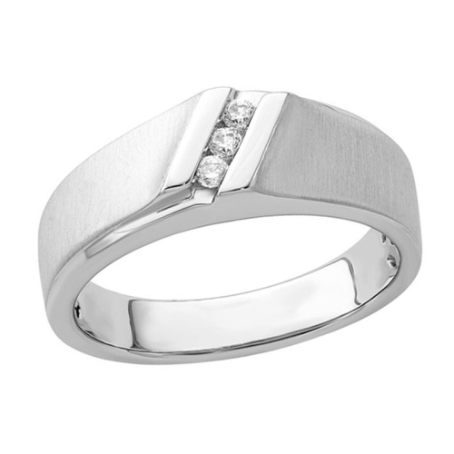 A classic mens 10 karat white gold ring with 3 small diamonds as the main centerpiece. This gold mens ring has total diamond weight of 0.105 carat (ctw) and weighs 7.25 grams.