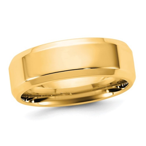 Decorated with a lovely and detailed finish, this 6.5mm polished 14 karat yellow gold beveled edge wedding band serves as the perfect offering as a pretext to a great and fulfilling union. This gold band weighs 6.90 grams and is a comfort fit band.