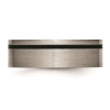 A sleek and strong titanium wedding band accented by a black stripe at the edge of ring.