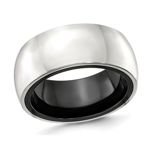 Striking in its elegant simplicity, this 10.00mm band ring is fashioned in strong black titanium with a polished sterling silver dome design set on top of it. This titanium band can be worn with anything anytime, making it a very special mens band. This titanium and sterling silver ring weighs 14 grams.