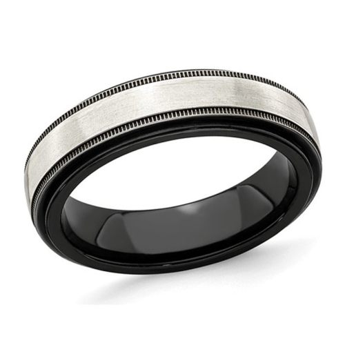 Striking in its elegant simplicity, this band ring is fashioned in strong black titanium with a satin sterling silver center , and features a sophisticated milgrain design. This titatinium band can be worn with anything anytime, making it a very special mens band. This titanium ring weighs 5.86 grams.