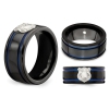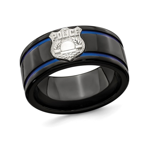 Striking in its elegant simplicity, this 100mm band ring is fashioned in strong black polished titanium with adonized blue stripes , and features a sophisticated polished sterling silver polise shield tagacross the top. This simple mens ring with police shield weighs 9.12 grams.