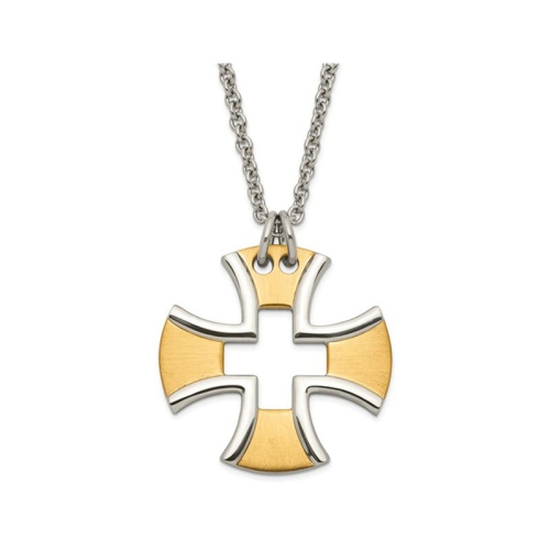 A strong stainless steel cross with yellow plating hangs from an 18 inch chain making this a classic and affordable cross pendant necklace. This pendant is 1 1/4 inch in length and width and weighs 11.10 grams.