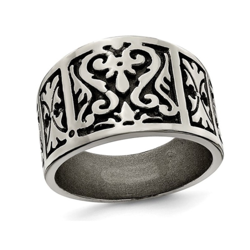 This black 14mm band ring has very unique look and incorporates a brushed and polished flat design . A very fashion forward mens ring he will be proud to show off. This 14mm wide titanium ring weighs 5.35 grams.
