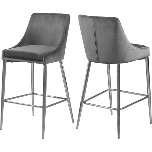 Yield to your contemporary side with this KarinaVelvet Stool in Gray. This modern stool is counter height, making it an ideal addition to a home bar or eat-in kitchen counter. The Gray velvet upholstery brings a neutral element to your room, so it can easily meld with other furnishings. Plump seat and back cushions ensure that guests sit comfortably, whether they're enjoying a sudsy brew or a stack of pancakes. The polished chrome metal frame is sturdy and stout, addin...