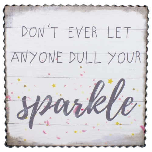 Canvas wall art with a metal frame. Designed to look like whitewash wood planks. Don't ever let anyone dull your sparkle inspirational message