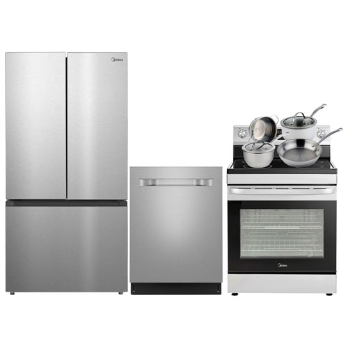 Upgrade your kitchen with the Midea 33-inch French door refrigerator, Midea 25-inch built-in dishwasher, Midea 30-inch electric range, and Meyer Nouvelle 6-piece cookware set bundle.