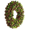 Frosted pinecones unlit Christmas wreath. Adorned with pinecones; pine sprigs and red berries. Includes a ring foam frame backing for hanging