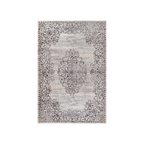 This ornate medallion rug's scrolling filigree pattern adds dreamy Bohemian cottage style to a living room, dining room, entry or bedroom. Mediterranean wrought iron is the inspiration for this design. The dark gray pattern on a lighter mingled background gives this rug a hand-woven, vintage vibe.