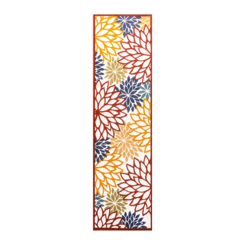 With its splashy, modern floral pattern in blue, red and orange, this indoor-outdoor rug has a fresh look that's ideal for a family room, dining room, bedroom, or kids' rooms. Choose from several colorways and add a splash of style to your porch or patio.