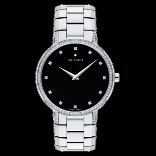Silver-tone stainless steel case and bracelet. Silver-tone diamond set bezel. Black with a single cabochon marker with 12 diamon dial with silver-tone hands and diamond hour markers. Quartz movement. Scratch resistant K1 crystal. Case size: 39 mm. Deployment clasp. Water resistant at 30 meters / 100 feet. Functions: hour, minute. Additional Info: 108 diamonds = 0.421cttw. Faceto Series. Dress watch style. Watch label: Swiss Made. Movado Faceto Quartz Diamond Men's Watch 0607482.