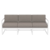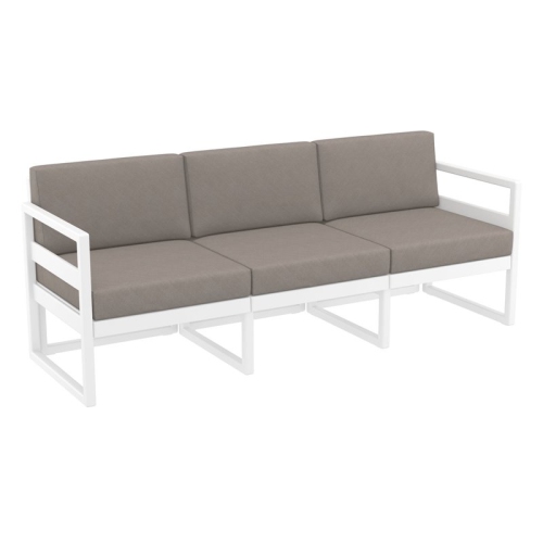 Mykonos Three Seater Sofa in White Finish with 100% Acrylic cushions features a clean modern design. No metal parts to rust, no moving parts that can break. Made for commercial durability. Extremely durable for outdoor temperatures. Frame made of commercial grade polypropylene. With 4 inch 100% Acrylic "Taupe" outer fabric cushions made of high density foam wrapped in Dacron. Resistant to U.V, chlorine, salt, stains, suntan oils. Easy to keep clean. Maintenance free....