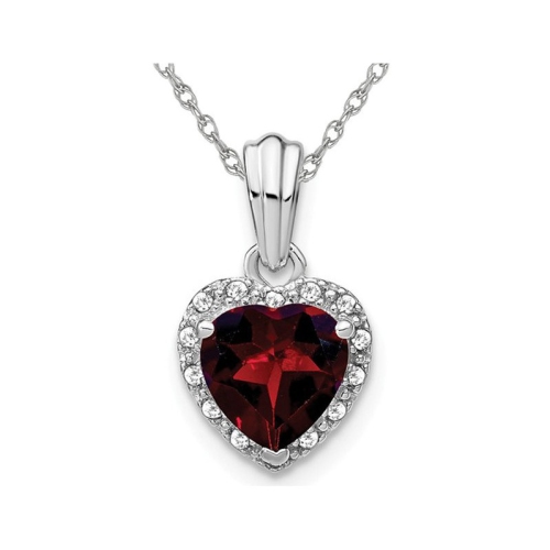 A classic heart pendant featuring a natural rich red heart cut garnet gemstone 1.15 Carats (ctw) set in a sleek sterling silver and a matching silver chain. This heart pendant necklace features the birthstone for January and includes sparkling accent diamonds surrounding the juicy red gem.