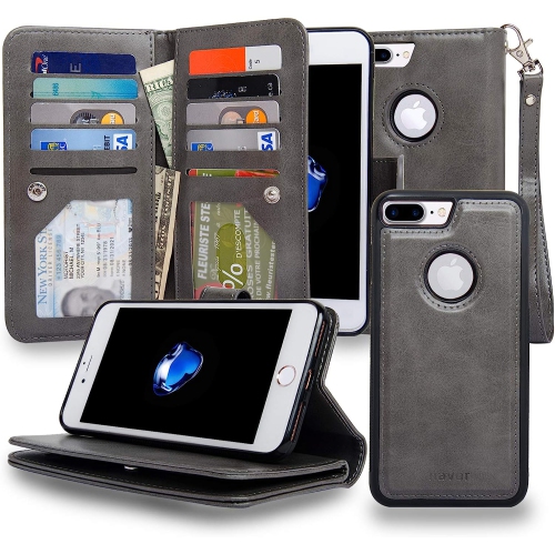 Navor Magnetic Detachable Wallet Case [RFID Protection] [10 Card Pockets] [3 Money Pockets] Compatible for iPhone 7 Plus JOOT-3L Series - Gray