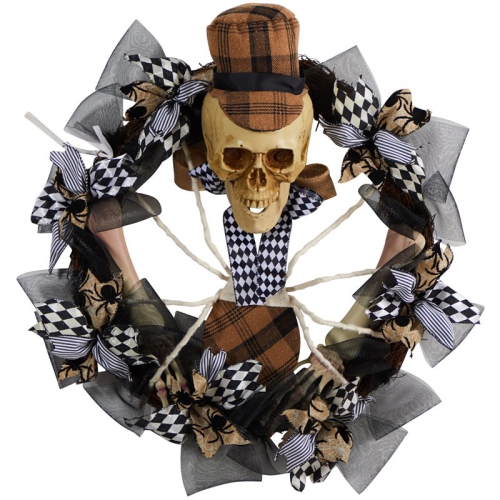 Nearly Natural 24" Halloween Skull in Plaid Mesh Wreath in Black