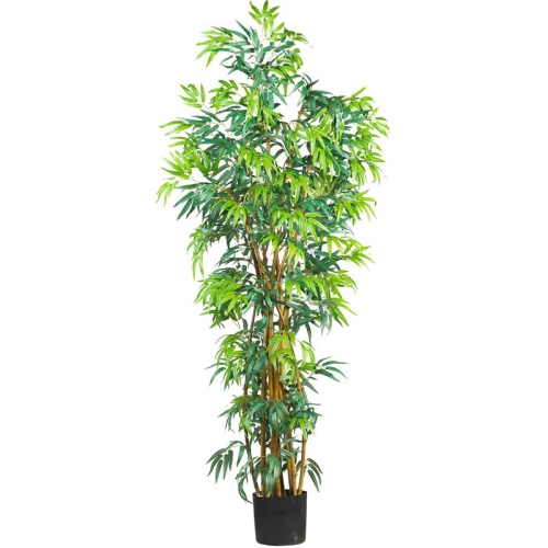 Need a break from the office? This grand Bambusa will have you dreaming of the Asian tropics. At six feet tall, this lovely tree makes an excellent conversation piece for your work space or home décor. 1700 wispy elongated leaves flock the two separate clusters of shoots. Best of all, this exotic beauty will thrive carefree in any environment.Features : Color: Green / Container: BlackMaterials: Polyester material, plastic, Natural Trun...