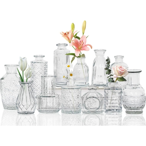 🌴【VINTAGE DESIGN】You get 12 glass bud vase, Each small vase is adorned with an etched pattern that further enhances the appeal. They are vintage yet elegant and can be used for any occasion, from elegant to simple and casual. They will make beautiful decorations for a windowsill, dining table or wedding table.