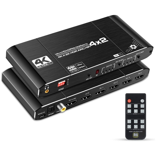 4x2 HDMI Matrix 4K 60Hz UHD 2.0v Switch Splitter with Audio Extraction ARC EDID IR Remote Control YUV 444 HDCP2.2 HDR (100% Brand new and High quality)INTRODUCTION* This 4K 4x2 HDMI Matrix allow users select any of the four HDMI signal sources to display on any two display devices. The maximum resolution reach up to 4K2K@60hz YUV4:4:4, supports HDMI ARC and audio extraction.
