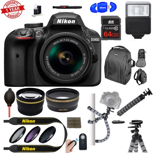 Nikon D3400 24.2 MP DSLR Camera w/ AF-P DX 18-55mm VR Lens Kit + Memory Bundle - US Version w/ Seller Warranty