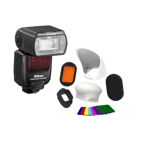 Nikon has reimagined both on- and off-camera lighting with the SB-5000 AF Speedlight, which brings revolutionary radio control to the Creative Lighting System with Advanced Wireless Lighting and comes equipped with a worlds first shoe-mounted flash cooling system that enables up to 100 consecutive full-power flashes. These features alone are enough to put it at the top of the speedlight heap, but the SB-5000 doesnt rest and provides a powerful guide number of 113 at ISO 100 and 35mm while also shrinking in overall size compared to its predecessors.Of course, the SB-5000 AF Speedlight is fully compatible with Nikons i-TTL automatic exposure system found in a majority of their cameras for fast, accurate operation. The radio control implemented in the SB-5000 requires a compatible DSLR using the WR-A10 Wireless Remote Adapter and WR-R10 Wireless Remote Controller in order to fully realize the power of the system. This enables the camera and flash to wirelessly control up to six groups of flashes from up to 98 away, without requiring any line of sight. Also, the SB-5000 and the radio system are fully compatible with the existing optical triggering method of older units and can even be mixed and matched for maximum versatility.Designed for reliability as well as versatility, the innovative built-in cooling system of the SB-5000 is a first for shoe-mounted flashes. It vents heat quickly and efficiently, allowing you to fire up to 100 consecutive full power flashes without issue. It also means that the flash can be made smaller without compromising performance. This new design also ensures speedy and intuitive operation, implementing an Info button for fast access to some of your most commonly used settings.As a standard flash the SB-5000 will not disappoint, providing a wide ranging zoom head of 24-200mm which can be extended down to 14mm with use of the built-in diffusion panel. The head will also tilt from -7 to +90° and rotate left and right 180° for complete bounce capabilities. Full sync mode support is available with slow, high-speed, 1st and 2nd curtain options.The flash has a quick recycle time of 1.8-2.6 seconds and runs on four AA batteries. It can be powered by select external battery packs. A PC terminal can be found on the SB-5000 for further triggering options and it comes with a stand, diffusion dome, fluorescent and incandescent filters, and a soft case. Radio control Advanced Wireless Lighting when used with a D5 or D500 DSLR equipped with WR-R10 Wireless Remote Controller and WR-A10 Wireless Remote Adapter