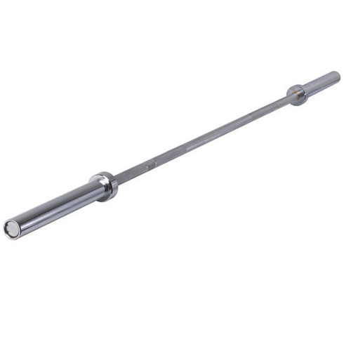 7ft, 45lb chrome barbell, equipped with bearings and knurling grip. Bar capacity, 750 lb