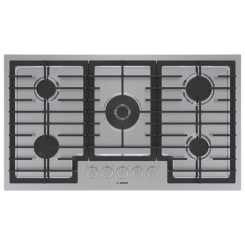 Prepare a wide variety of dishes effortlessly with the Bosch 36-inch gas cooktop. Its five burners, including a powerful dual-flame burner, offer versatile cooking options from high-heat searing to gentle simmering. The OptiSim front left burner features a wider and thicker design to ensure even heat distribution for perfect cooking results.Open Box - Bosch 36" 5-Burner Gas Cooktop (NGM8659UC) - Stainless Steel - Perfect Condition