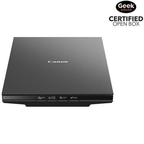 Upgrade your home office set up with the Canon CanoScan LiDE 300 scanner. Its 10-second scanning feature allows you to scan documents in a jiffy. This scanner boasts a 2400 x 2400 dpi resolution with image enhancements, like fade correction and dust reduction, that capture images and words in stunning clarity.Geek Squad Open Box