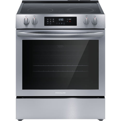 Cook and bake ingredients to perfection with the versatile Frigidaire 24" free-standing electric range. It's equipped with a 5.3 cu. ft. fan convection oven for efficient baking and broiling with no hot spots, and a four-element smooth glass cooktop for cooking. It also includes a built-in storage drawer for extra cookware and bakeware.Open Box - Frigidaire 30" 5.3 Cu. Ft. Freestanding Electric Range (FCFE308CAS) - Stainless Steel - Perfect Condition