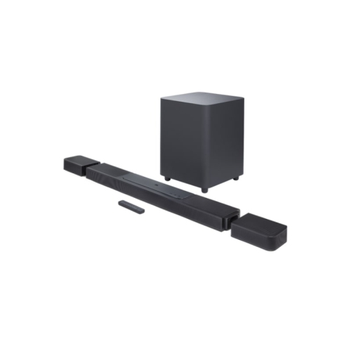 Optimize your listening experiences with the JBL Bar1300X 11.1.4 channel sound bar. It offers 1170W of total system power, with four up-firing drivers in the main bar, a wireless subwoofer, and two detachable speakers for immersive Dolby Atmos surround sound. Connect wirelessly or via HDMI to your devices to bring powerful sound home.