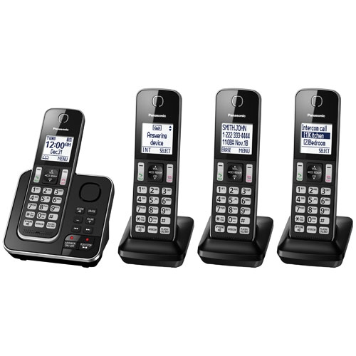 **Open Box product. Minimum 1-year warranty. See more information below.** Pick up this Panasonic 4-handset cordless phone and say hello to some super convenient functions to keep you connected while you’re at home. Featuring a sleek and compact design, it features a built-in answering machine, talking caller ID, call block, night mode, intelligent ECO mode, handset locator, and intercom.