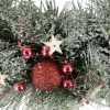 Adorned with red ball ornaments; mini beads; wooden stars and more. Its frosted finish captures the essence of a freshly snow-covered pine forest. Easy to hang on doors or walls with the attached jute twine loop