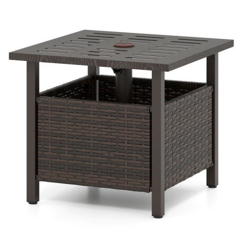Add function and style to your patio with this outdoor side table crafted from all-weather PE wicker. Designed with a built-in umbrella hole, it pairs perfectly with most standard patio umbrellas for added shade and convenience. The compact tabletop provides space for drinks, snacks, or décor, while the durable wicker weave and sturdy frame ensure long-lasting use.