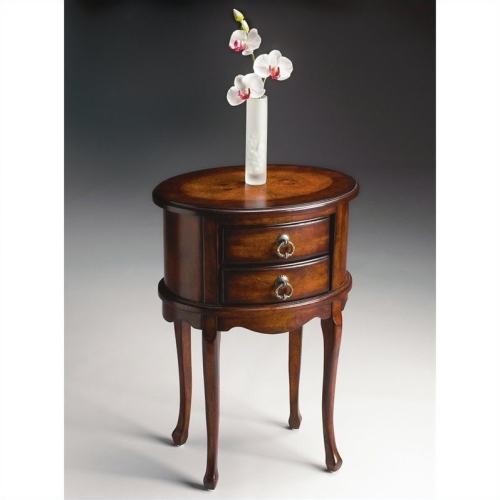 This charming oval side table combines elegant design details with convenient storage. It features a rich, hand rubbed Cherry finish with light distressing. Hand crafted from select hardWood solids and Wood products, it has an attractive ash burl veneer top inset surrounded by walnut and cherry veneer borders . Includes two drawers with antique brass finished hardware.Features : Cherry FinishCrafted from selected hardwoods with choice...