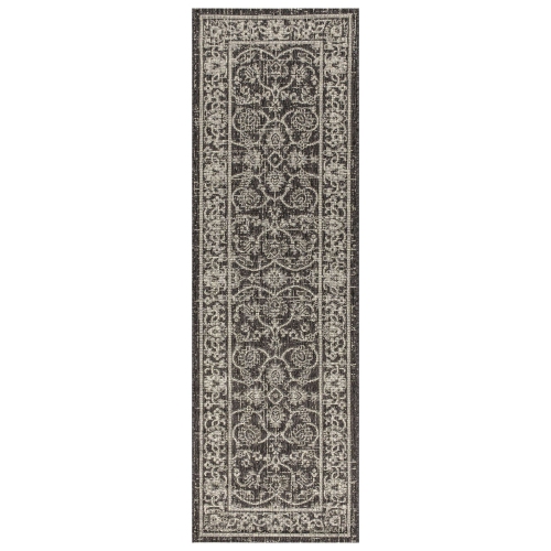 With its twining vines and ornate border, this traditional pattern is an elegant addition to your outdoor porch or patio. Varied tones of charcoal and black mingled with a light gray pattern give this rug a rich, hand-woven texture.
