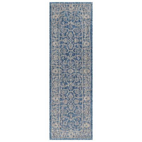 With its twining vines and ornate border, this traditional pattern is an elegant addition to your outdoor porch or patio. Varied tones of blue and navy mingled with a light gray pattern give this rug a rich, hand-woven texture.