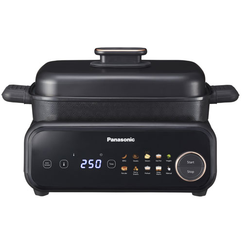 The Panasonic BBQ & grill multi-cooker brings versatile cooking to your kitchen with five-in-one functionality and nine auto presets. Its integrated smoke removal system lets you enjoy grilling indoors, while its compact design makes storage easy.