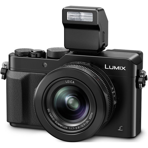 The black Panasonic Lumix DMC-LX100 Digital Camera is an advanced Four Thirds format point-and-shoot with manual controls designed to enable and inspire creativity. It features a large multi-aspect 4/3 type MOS sensor to produce 12.8MP still images (4:3) and 4K Ultra HD video at 30 and 24 fps. You also have the ability to extract high-resolution 8MP images from the 4K video, letting you capture entire scenes without missing a shot.The built-in Leica DC Vario-Summilux zoom lens provides a 35mm-equivalent focal length range of 24-75mm, covering wide-angle to portrait-length perspectives. With a fast maximum aperture of f/1.7-2.8, the lens lets you work in lower light situations and provides selective focus control for shallow depth of field imagery, enhanced by a nine-bladed aperture for smooth out-of-focus rendering. When more light is needed, the camera features an integrated hot shoe, letting you use external flash units. A compact flash unit is included with the camera, matching the style and color of the body, and providing a GN of 23 (7m) at ISO 100.The lightweight, compact body features both an electronic viewfinder and a rear LCD screen. The high-density 2,764k-dot viewfinder lets you confidently frame your shots, even in bright outdoor environments. Delivering approximately 100% of the Adobe RGB color space, the viewfinder accurately reproduces hues, so you know what you see is what youre capturing. The rear 3.0 screen is also available, with a 921k-dot resolution. Additionally, built-in Wi-Fi connectivity with NFC allows remote camera control and image sharing from linked mobile devices using the Panasonic Image App.4/3 Type MOS Sensor