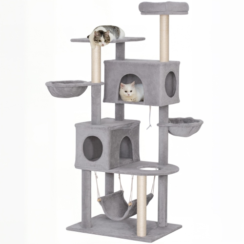 PawHut Cat Tree, 66 Inch Large Cat Tower with 2 Door Condos, 3 Big Hammocks, Plush Top Perch, Sisal Scratching Posts, Multi-level Kitty Tree for Indoor Kittens, Light Grey