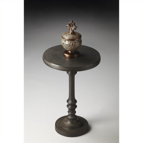 Crafted from cast aluminum, this table of a thousand identical and intentional indentations – from base to tabletop – features an impeccably turned pedestal and a compelling light bronze tone.Features : Finish: BronzeMaterial: Cast AluminumShape: RoundStyle: TransitionalDistressed finishSpecifications : Product Dimensions : 23.5" H x 15.75" W x 15.75" DProduct Weight : ...