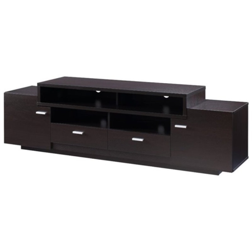 Features:Finish: CappuccinoSturdy wood frame for lasting qualityMaterials: Wood, VeneersSleek modern design with multi-level top surface2 open shelves with rear wiring access2 drawers on double metal glides2 cabinets with T-bracket hingesMetallic hardware accentsSpecifications:Overall Product Dimensions: 15.25" H x 72" W x 21.25" D...