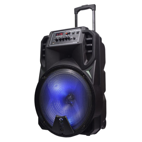 15” Portable DJ Speaker with changeable flashing LED lights, USB,AUX, microphone input, karaoke compatible, and wireless connectivity to pair with your devices. Take it anywhere with the built-in rechargeable battery