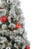 Bring the outdoors in with this charming pre-lit pine tree. With it's snow-frosted branches, this tree not only brightens your surroundings but also complements your holiday home decor. The tree comes pre-adorned with charming red and silver ornaments and is nestled in a weighted silver pot. Perfectly designed for compact spaces, this tree is ideal for adding a touch of holiday magic to your home. Product Features: Pre-lit with 100 clear lights Bulb size: mini Bulb type: incandescent 196 tips 3" wide tapered tip 60" green lead cord Additional Product Features: Slim profile tree Light sets on the tree are UL certified and approved for indoor or outdoor use, however, the tree itself is recommended for indoor use only If one bulb burns out, the rest will stay lit Comes with replacement bulbs and spare fuses 3-piece easy assembly (including pot) Comes in a weighted silver pot Wire gauge: 22 120 volts, 60 hertz, .17 amps, 20.4 watts Dimensions: 5’ high (from the base of the pot to the top of the tree) 27” base diameter (at the widest point) Pot:13.25" high x 8.5" diameter Material(s): PE/PVC/metal/plastic/glass bulbs/wire Note: Branches are compressed for shipment, and need to be fluffed out upon arrival to look like the photo