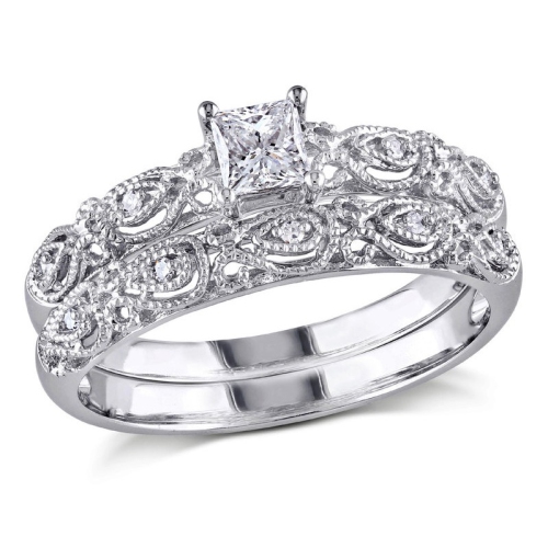 This majestic bridal ring set is composed of an engagement ring that features a princess-cut white center stone accented by four round white diamond side stones, while the wedding band is designed with five additional diamonds. The divine pair is crafted of 10-karat white gold and shimmers with a high polish finish.