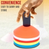 The PRISP set of flat cones is made of soft and durable plastic, making the flexible and long-lasting. They are multi-functional and can be used for agility, strength, speed training, as boundary markers, and more. They are stackable for convenient and organized carrying and storage, and their bright colours increase their visibility. The cones come in a set of 50 and the stand is included.